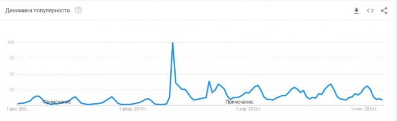 Отже, рівномірна хвилеподібність графіку спостерігається і до, і після 2014 року — зі зрозумілих причин, — але за доби російського контролю кількість запитів суттєво зросла. Якщо пікові значення у 2010-2013 рр. складали в середньому 12,5% від максимуму, то упродовж 2016-2019 рр. — уже 31,5%, і суто візуально тенденції до зниження не спостерігається.