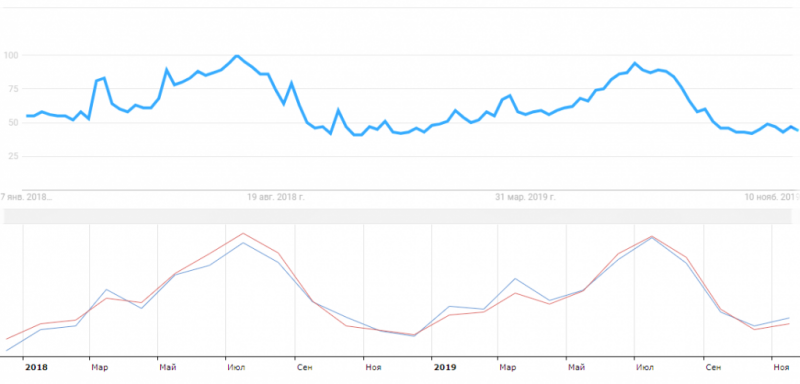 Як же їх виміряти? По-перше, просто порівняємо дані із запиту «Крым» з двох пошукових машин за 2018-2019 роки — Яндекс Wordstat не дає можливості зануритися глибше.