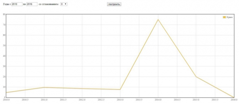 По-друге, звернімося до інструмента N-gram, розробленого Яндексом для Національного корпусу російської мови. Там за запитом «Крым» збудуємо графік за 2010-2016 рр. (за 2016-й і далі, на жаль, дані не оброблені), який матиме наступний вигляд.
