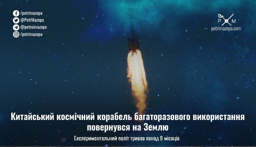 Китайський експериментальний космічний апарат багаторазового використання повернувся на Землю в понеділок вранці. Таким чином він успішно завершив 276-денні випробування.