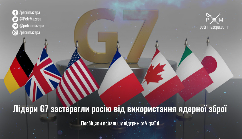 Глави держав «Групи семи» у вівторок ухвалили спільну заяву після позачергової зустрічі у зв’язку з ракетними обстрілами цивільної інфраструктури України, в якій застерегли РФ від застосування хімічної, біологічної та ядерної зброї.