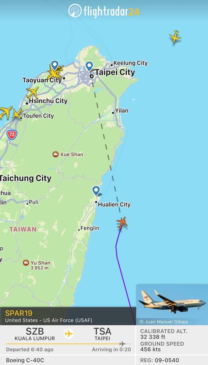 За даними сервісу Flightradar24, літак із Ненсі Пелосі, спікером Палати представників США, увійшов у повітряний простір Тайваню. Літак почав знижатись, готуючись до посадки.