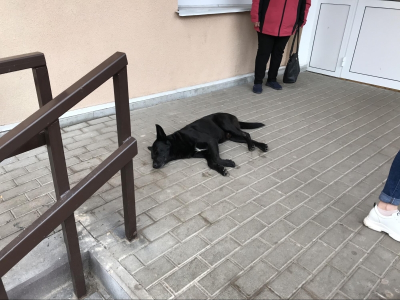 Серед людей у черзі дрімає чорний пес. Жінка обурюється цим фактом, бо переконана, що від лежачого поряд собаки можна заразитися коронавірусом. Чи то жартома, чи то всерйоз вона звертається до поліцейського, котрий стоїть неподалік, з проханням прогнати тварину, але той не реагує.