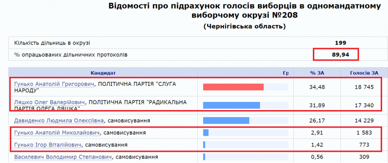 Інтрига на 208-му окрузі нині шалена: лідери перегонів постійно змінюють одне одного на першій сходинці в таблиці результатів, розрив між ними протягом підрахунку варіюється від тисячі до кількох десятків голосів. Варто зазначити, що два безробітні «клони» Гунька, за попередніми підрахунками, сумарно набирають понад 2 тисячі голосів. Тож, якби не їхнє балотування, кандидат від «Слуги народу» був би беззаперечним переможцем.