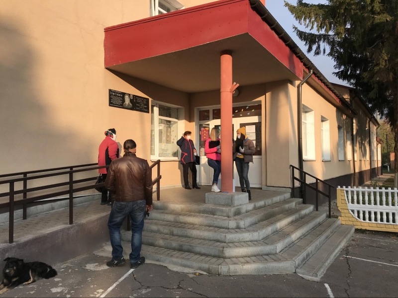На вході до будівлі стоїть жінка, котра безконтактним термометром вимірює у виборців температуру. Деякі, очікуючи своєї черги в коридорі, ознайомлюються з плакатами, на яких розміщена інформація про кандидатів.