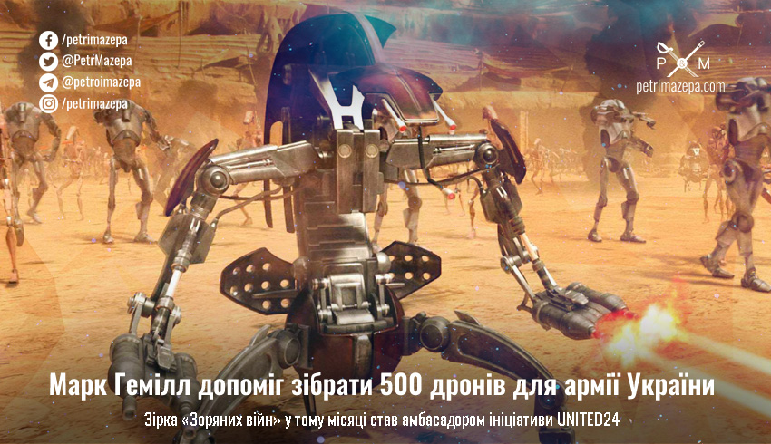 Актор Марк Гемілл (зіграв Люка Скайвокера) виступає послом зі збору коштів для проєкту «Армія дронів». Й на думку Bloomberg Radio, це могло бути анонсом нової частини «Зоряних війн», а не реальним збором на допомогу Україні. А тому привертає додаткову увагу.
