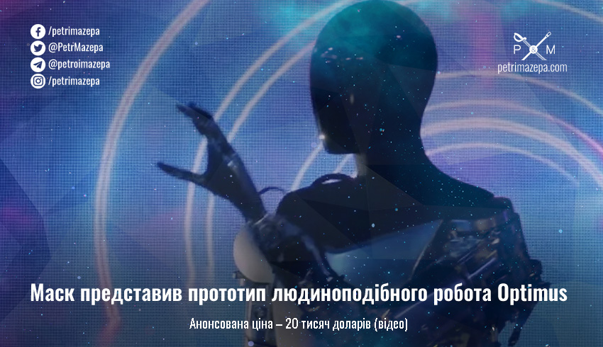 Ілон Маск представив прототип людиноподібного робота Optimus. Його можна буде купити за 20 тисяч доларів у найближчому майбутньому. Маск сказав, що очікує, що Тесла буде готова приймати замовлення на робота через три-п'ять років.