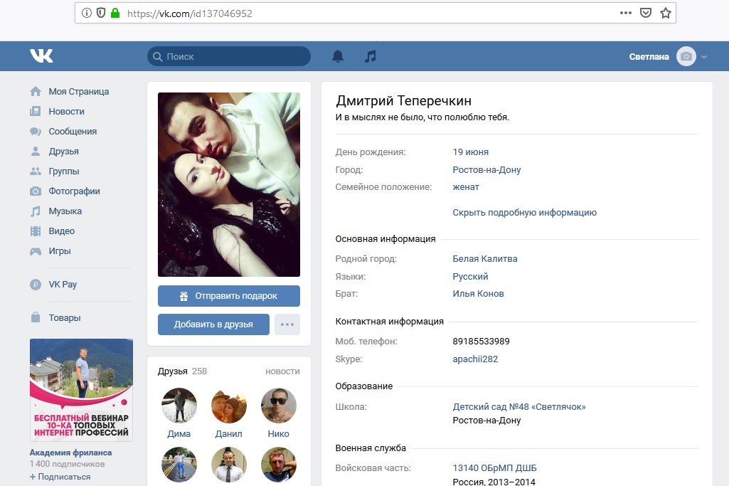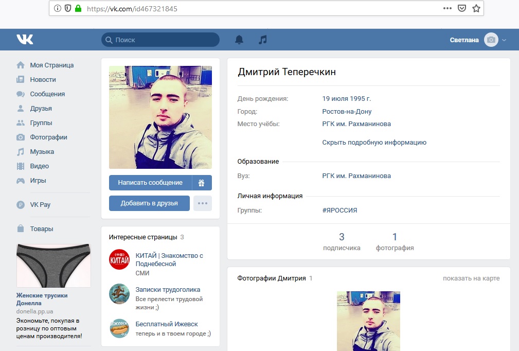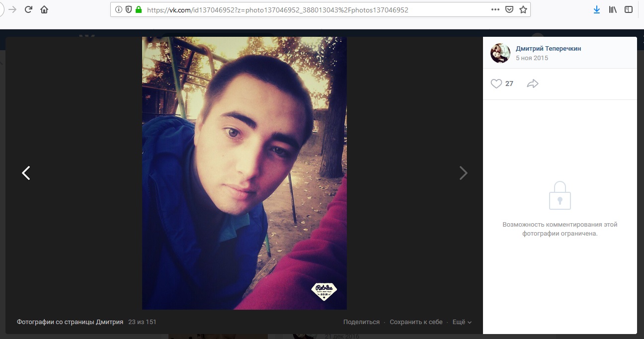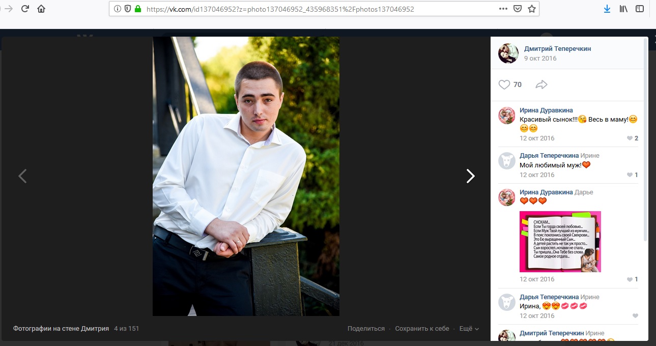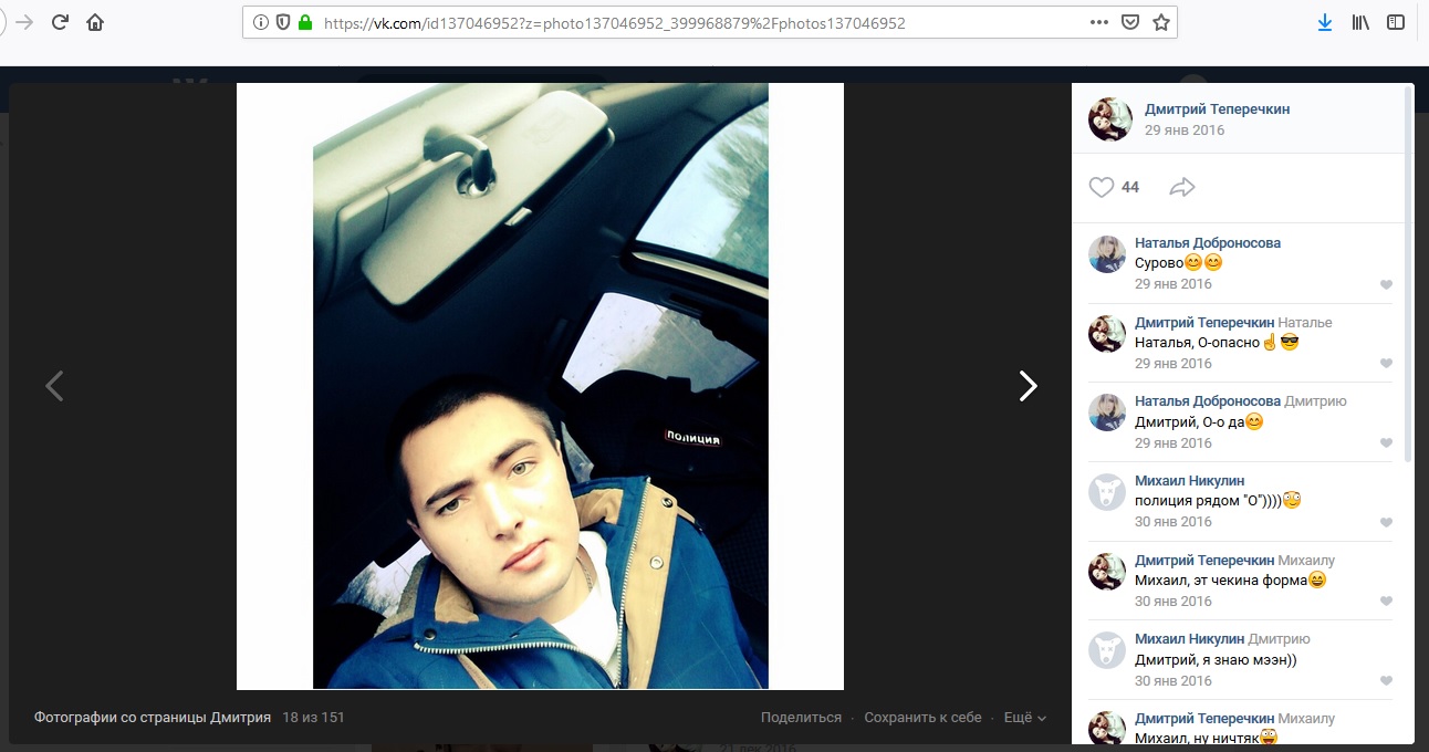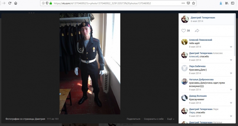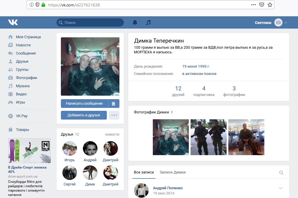 Сторінки соцмереж, скріншоти та фотографії Д. Теперечкіна