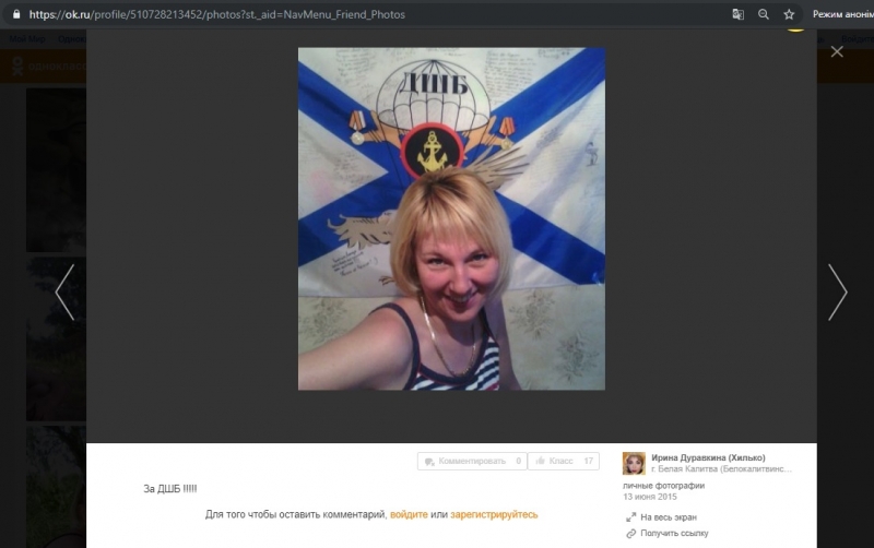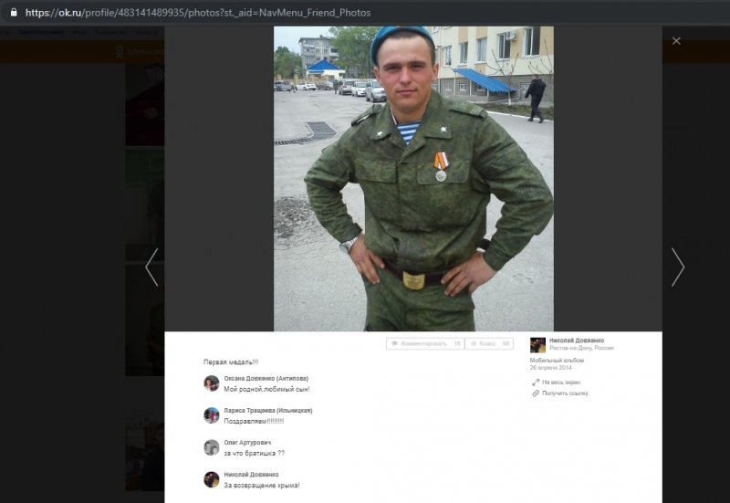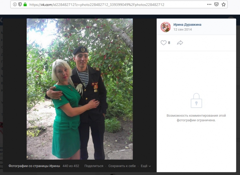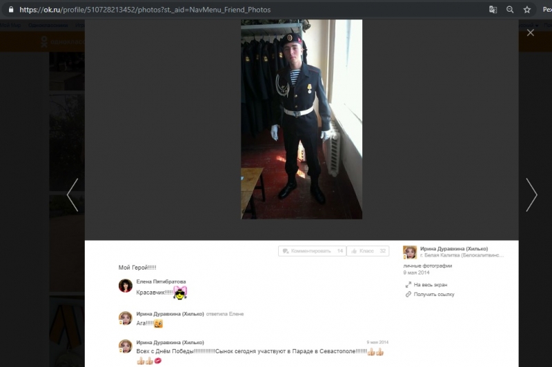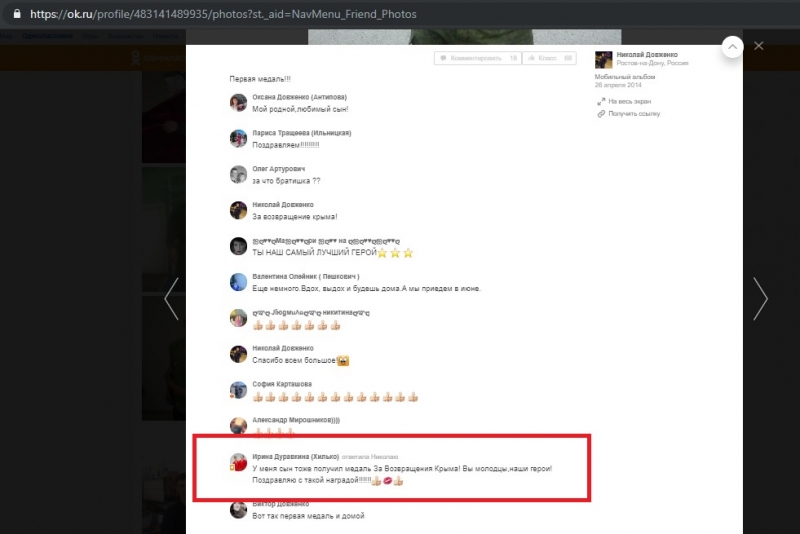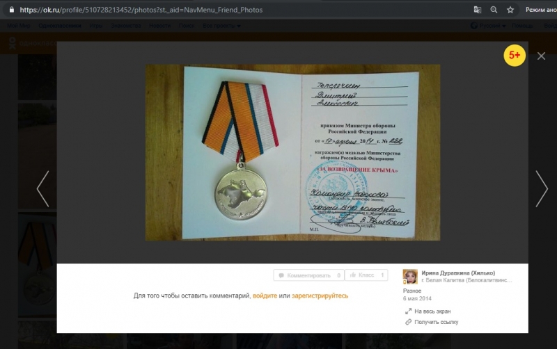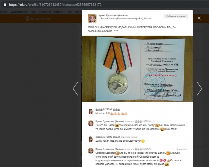 Отже, переходимо на профіль Ірини Дуравкіної і справді знаходимо у фотоальбомі фотографії сина з медаллю за окупацію Криму, а також фотографію нагородного посвідчення до медалі: