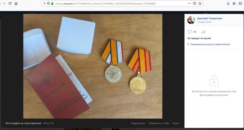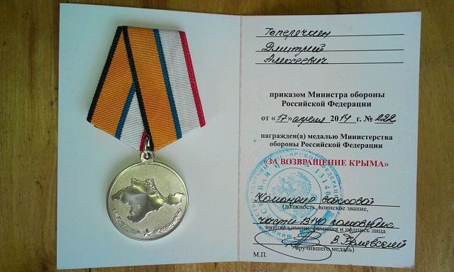 Д. Теперечкін теж опублікував фото медалі за окупацію Криму, а також посвідчення, щоправда, не в розгорнутому вигляді, тому ми висловлюємо подяку Ірині Дуравкіній, яка викрила сина, опублікувавши розгорнуте посвідчення до медалі.