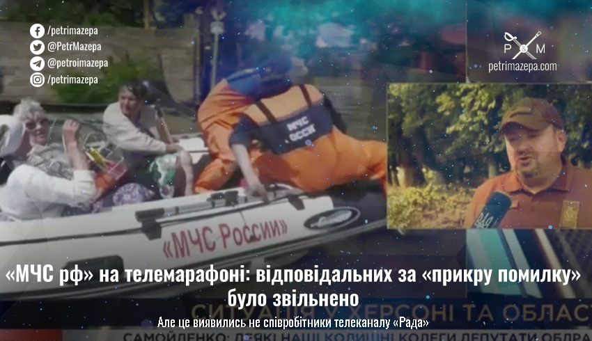 Відео з росіянами з’явилося в ефірі телемарафону 9 червня — тоді у слоті державного телеканалу «Рада» з’явилось відео, де ймовірно, представники країни-агресора евакуювали людей на ними ж затопленій території. На цьому тлі йшла розмова журналістки каналу «Рада» з головою Херсонської облради Олександром Самойленком щодо ситуації в регіоні та евакуації мешканців.