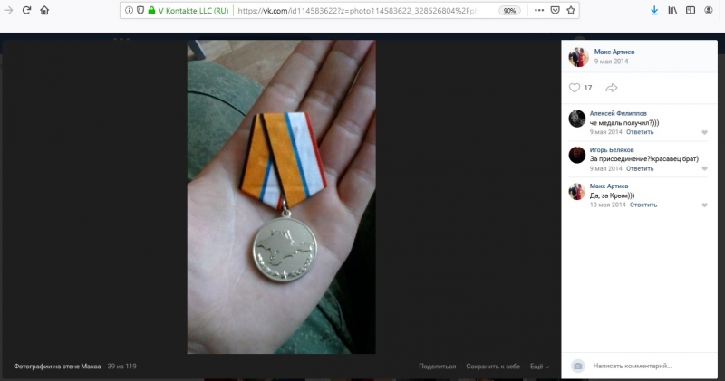 9 травня 2014 року Артієв опублікував фото медалі за окупацію Криму.
