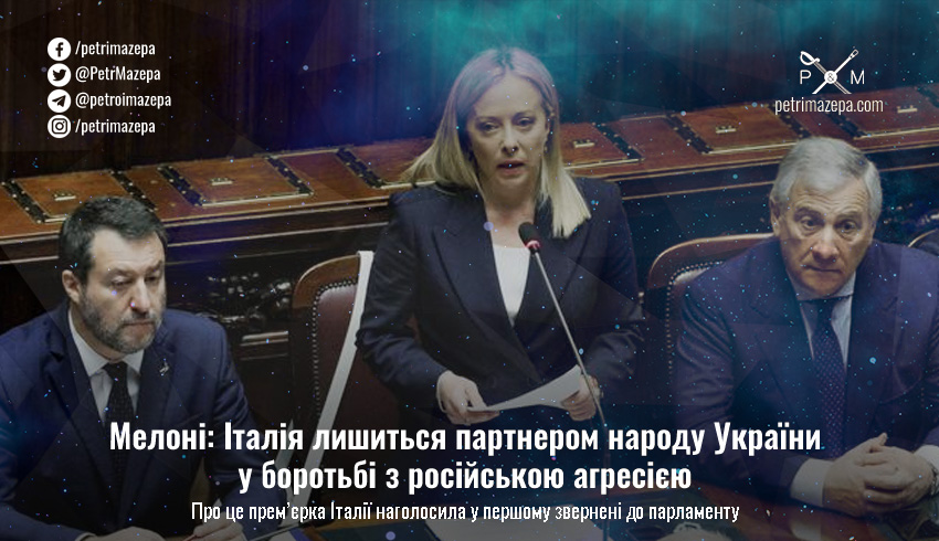 Прем’єрка Італії Джорджа Мелоні у першому звернені до парламенту заявила, що першим вузлом проблем, які необхідно вирішити, є енергетичні. Але вони невідривно пов’язані із зовнішньополітичними відносинами. Й тому вона одразу наголосила, що Рим не піддасться на енергетичний шантаж Путіна і залишиться партнером України.