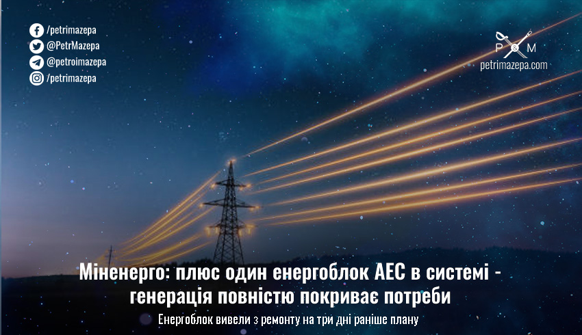 Генерація повністю покриває потреби споживачів, повідомляє Міністерство енергетики України. Приблизно половину енергії виробляє атомна генерація. Яка поповнилася ще одним працюючим енергоблоком — 1000 МВт потужності повернулися до роботи на три дні раніше плану.