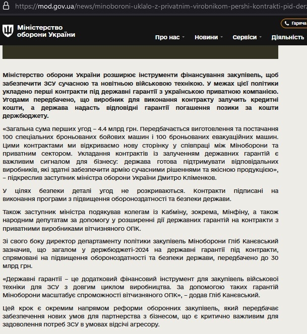 Міністерство оборони уклало перші контракти під державні гарантії з українською приватною компанією.