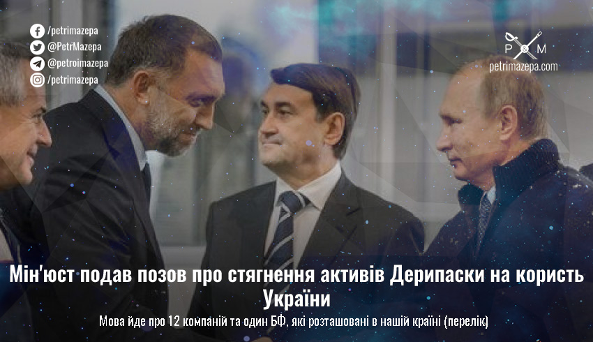 Міністерство юстиції подало позов до Вищого антикорупційного суду про стягнення активів російського олігарха Олега Дерипаски в дохід держави. Вказується, що Дерипаска є громадянином рф, підтримує путінський режим щонайменше тим, що отримує вигоду від уряду росії та виробництва бронетехніки, яка застосовується країною-агресором у війні проти України.