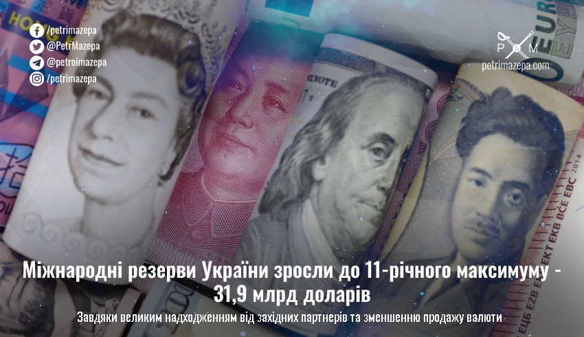 Міжнародні резерви України зросли до 31,9 млрд доларів за підсумками березня, сягнувши одинадцятирічного максимуму. За місяць НБУ отримав понад 5 млрд доларів міжнародної допомоги та на третину знизив обсяги валюти, яку він продавав на валютному ринку.