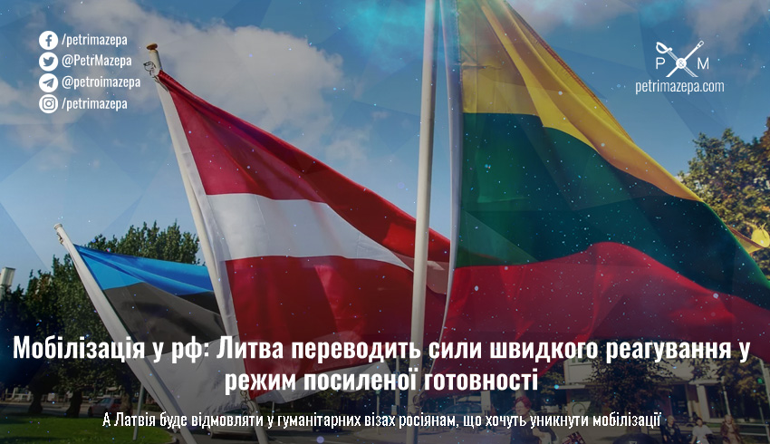 На мобілізацію у росії відреагували країни Балтії – Литва переводить власні сили швидкого реагування у режим посиленої готовності, а Латвія вже заявила про намір відмовляти у гуманітарних візах росіянам, які намагаються уникнути мобілізації.