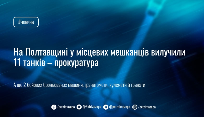 Правоохоронні органи Полтавщини вилучили у місцевих мешканців 11 танків та 2 бойові броньовані машини. Про це повідомляє «Укрінформ» із посиланням на звіт Полтавської обласної прокуратури, оприлюднений Полтавською облрадою.