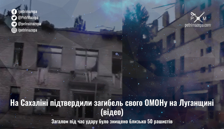 - У ранковому зведенні 24 липня повідомлялося, що «поблизу Лисичанська під смертельний вогонь потрапив ОМОН із Сахаліну. А в Кадіївці зруйновано казарму з військовими». Таким чином можна припустити, що відео з підтвердженням у нас з другого озвученого випадку, а ОМОНівці, смерть яких підтвердили на Сахаліні, або не доїхали під Лисичанськ або знаходять під іншими руїнами.