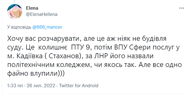 За уточненими даними, локація «під Лисичанськом» плавно перемістилася до Кадіївки, а будівля суду стала колишнім ПТУ. Але ж мертві орки під руїнами залишились.