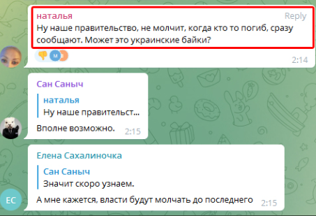 Також представлено обговорення новини про загиблих ОМОНівців в одній із місцевих груп у Telegram. Де одні запевняють, що влада повідомила б, якби загибель була насправді. А інші розповідають про загиблих та тих, хто вижив, але повернувся додому частково.