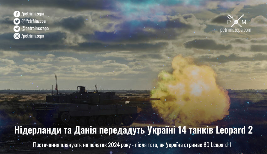 Данія та Нідерланди домовились спільно відправити в Україну 14 танків Leopard 2. Вони будуть готові до постачання на початку 2024 року. А до кінця 2023 року планується поставити до України не менше ніж 80 Leopard 1.