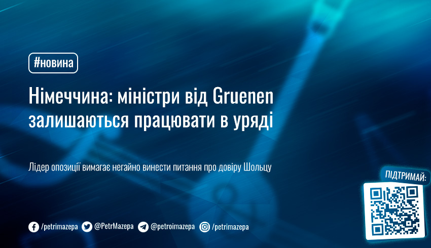Представники партії Gruenen («Зелені») продовжуватимуть працювати в діючому уряді Німеччини до нових парламентських виборів, які, ймовірно, відбудуться на початку наступного року.