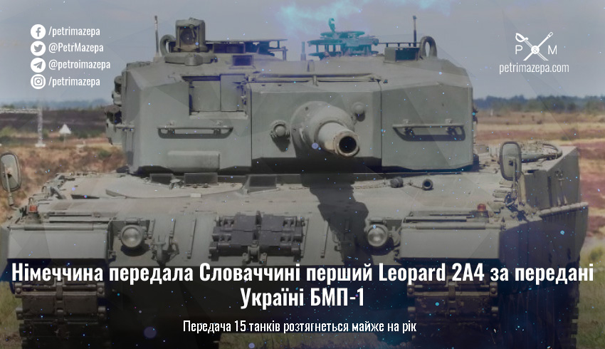 Німеччина передала Словаччині перший танк з 15 Leopard 2A4, які країна має отримати у рамках так «кругових» постачань. Раніше Словаччина надала Україні радянську техніку – 30 БМП-1.