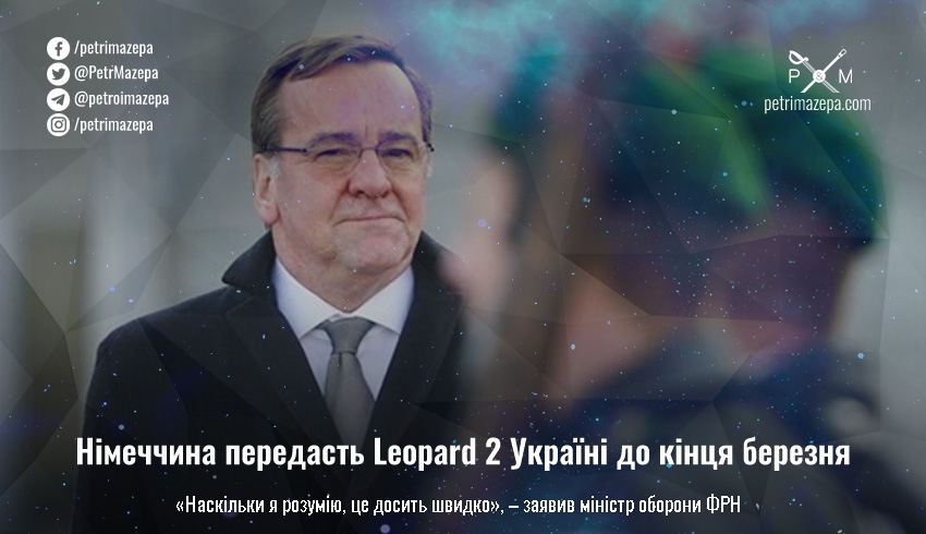 За оцінками міністра оборони ФРН Бориса Пісторіуса, Німеччина передасть танки Leopard 2 Україні наприкінці березня.