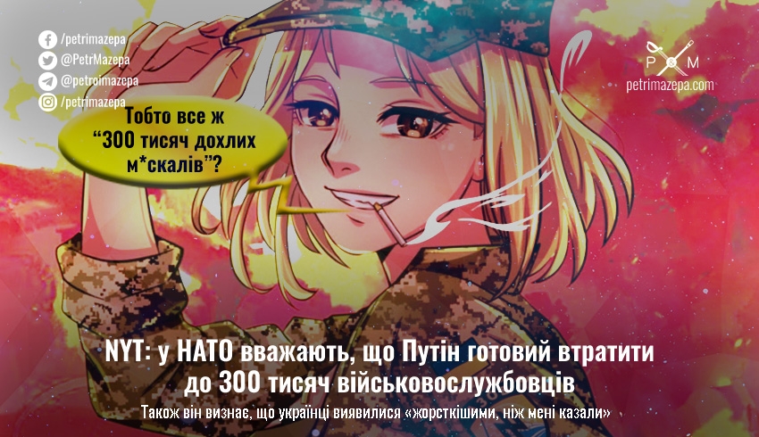 Водночас один із членів НАТО попереджає союзників, що Путін готовий погодитися на загибель або поранення 300 тисяч російських військовослужбовців. Поки що вбито трошки менш ніж 100 тисяч окупантів.