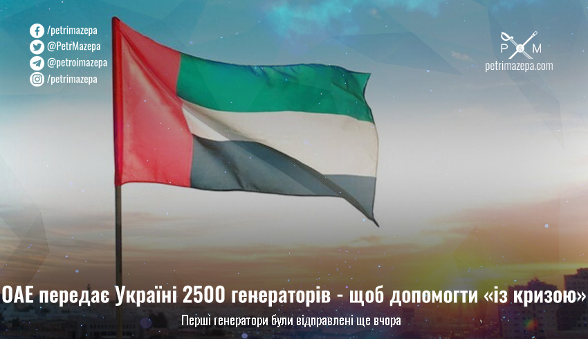 ОАЕ оголосили про надання Україні 2500 домашніх генераторів, щоб допомогти нам пережити цю зиму. Про це пише Інформаційне агентство ОАЕ (WAM).