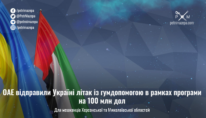 Об'єднані Арабські Емірати відправили Україні літак з гумдопомогою у рамках програми підтримки на 100 млн доларів. Це відбулось одразу після візиту до ОАЕ української делегації на чолі із першим віце-прем’єр-міністром — міністром економіки України Юлією Свириденко.