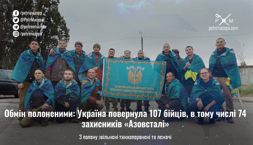 Україна провела черговий обмін полоненими — додому повертаються 107 воїнів, 6 офіцерів, 101 рядовий та сержант. Зі звільнених 74 бійці захищали «Азовсталь», деякі з них вертольотами летіли у Маріуполь, щоб рятувати життя та захищати місто.