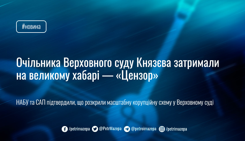 «Цензор», своєю чергою, повідомляє, що голову Верховного суду Всеволода Князєва затримано на хабарі в сумі майже 3 млн доларів.