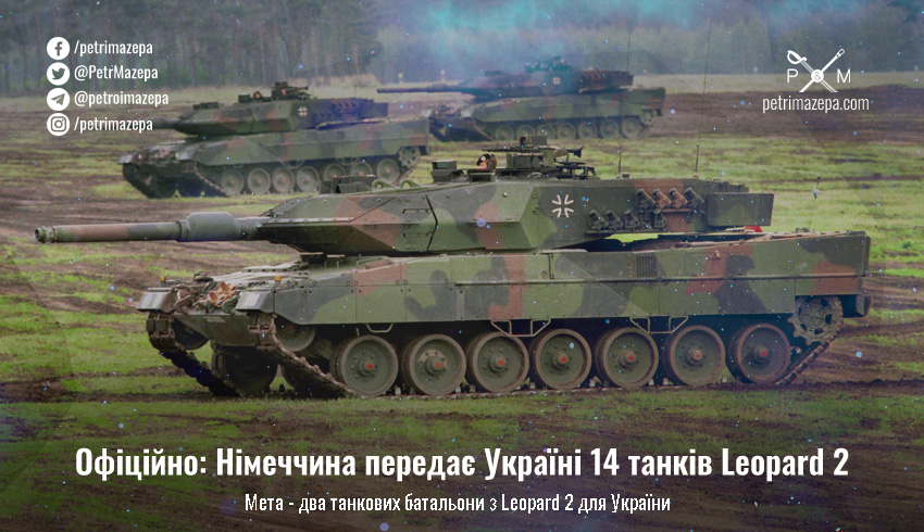 Німеччина офіційно заявила про початок передачі Україні танків Leopard 2 — як перший крок нам передадуть 14 машин, а в подальшому метою є швидке формування для України двох танкових батальйонів із танками Leopard 2.