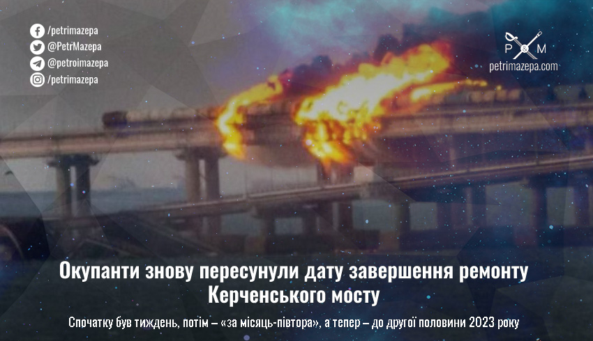 Країна-агресор офіційно визначилася з термінами робіт щодо ремонту Керченського мосту, на якому дуже влучно «покурили» 8 жовтня. І хоча пропаганда спочатку намагалася приховати реальні масштаби руйнувань, тепер визнають — завершити ремонтні роботи, можливо, вдасться не раніше, ніж до другої половини 2023 року.