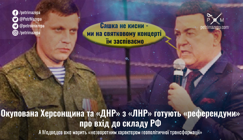 Окупанти хочуть терміново провести так звані «референдуми» на окупованій частині Херсонщини, а також у так званих «ДНР» і «ЛНР». Вони дуже активно демонструють процеси підготовки до «волевиявлення». А штатний «погрожувач» Кремля заступник голови Ради безпеки Росії Дмитро Медведєв вже пише про те, що після референдумів «геополітична трансформація у світі набуде незворотного характеру», а РФ захищатиме ці території усіма «силами самозахисту».