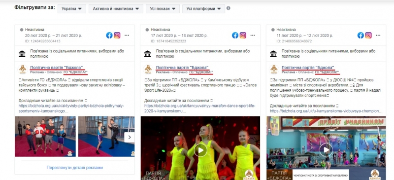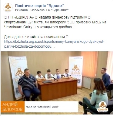 Від червня до 31 грудня 2019 року на рекламу політичної партії «Бджола» витрачено $6088. Видатки на рекламу у Facebook не потрапили до офіційних звітів партії.
