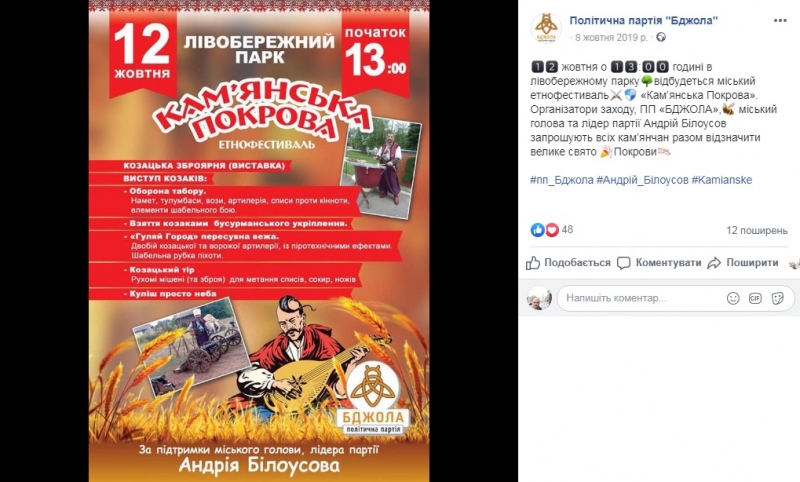 Організатори заходу, ПП «БДЖОЛА», міський голова та лідер партії Андрій Білоусов запрошують всіх кам’янчан разом відзначити велике свято «Покрови».
