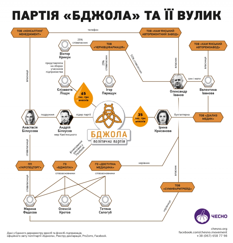 Майже 65 тис. грн перерахувала партії «Бджола» Єлізавета Ліщук з Ружина Житомирської області. У червні 2017 року на загальних зборах учасників ТОВ «Чернівціфармація» вона діяла від імені Віктора Крикуна, співзасновника зазначеного підприємства. Інший співзасновник цієї компанії Олександр Іванов — ще й засновник ТОВ «Кам’янський авторемонтний завод», що зареєстроване в Києві. Номер телефону заводу збігається з телефонним номером ТОВ «Консалтинг менеджмент», засновницею якого є Анастасія Володимирівна Білоусова, котра прописана у Дніпрі. Точно такі самі прізвище, ім’я та по батькові має дружина мера міста Кам’янське. До того ж, вона теж має квартиру в Дніпрі.