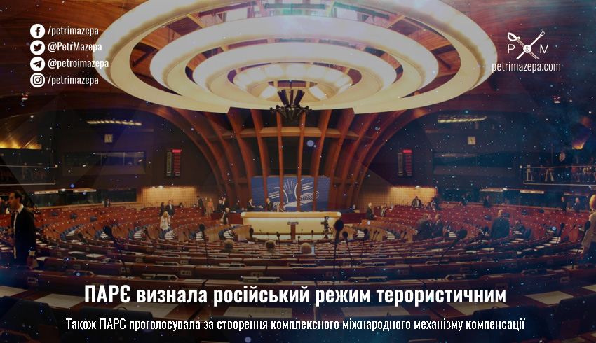Парламентська асамблея Ради Європи (ПАРЄ) за результатами термінових дебатів на тему «Нове загострення агресії російської федерації проти України» ухвалила резолюцію, у якій оголосила режим рф терористичним. Також ПАРЄ оновила свої оцінки та рекомендації та звернулась до держав-членів Ради Європи з низкою пропозицій по допомозі Україні.