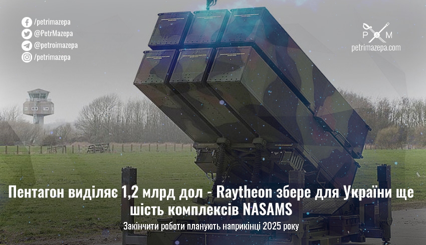 Пентагон уклав контракт із Raytheon Technologies на виробництво зенітних ракетних комплексів NASAMS для Збройних Сил України на суму понад 1,2 млрд дол. Роботи виконуватимуться в Тьюксбері, штат Массачусетс, з орієнтовною датою завершення 28 листопада 2025 року.