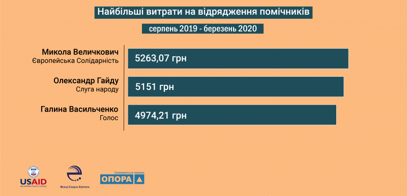 Щодо компенсації коштів на відрядження для помічників-консультантів депутатів, то на ці потреби було виділено 214 521,31 грн, і скористалися такою компенсацією менш як 90 парламентарів. Найбільшу суму компенсації отримали Микола Величкович (фракція політичної партії «Європейська Солідарність») — 5 263,07 грн, Олександр Гайду (фракція політичної партії «Слуга народу») — 5 151 грн і Галина Васильченко (фракція політичної партії «Голос») — 4 974,21 грн.
