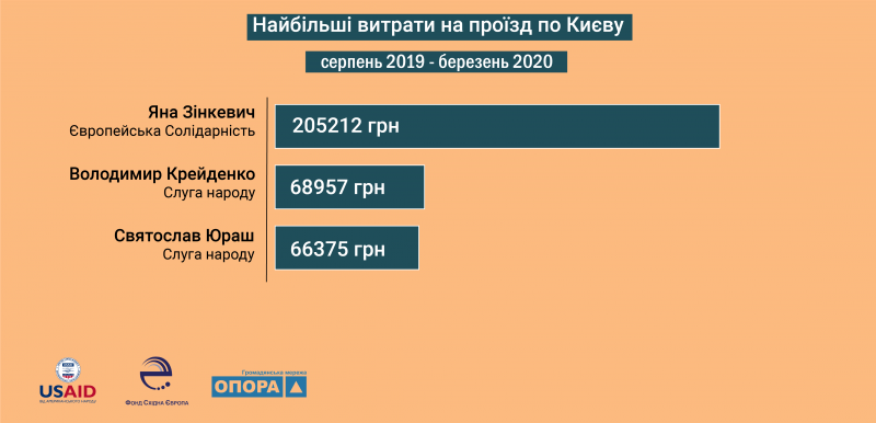 Також парламентарям компенсували вартість проїзду у межах міста Києва, загалом на суму 2 876 938 грн. Найбільше витратили Яна Зінкевич (фракція політичної партії «Європейська Солідарність») — 205 212 грн, Володимир Крейденко (фракція політичної партії «Слуга народу») — 68 957 грн і Святослав Юраш (фракція політичної партії «Слуга народу») — 66 375 грн, найменше — Юрій Павленко (фракція політичної партії «Опозиційна платформа – За життя» — 120 грн, Лариса Білозір (депутатська група «За майбутнє») — 146 грн, Ольга Коваль (фракція політичної партії «Слуга народу») — 146 грн та Людмила Буймістер (фракція політичної партії «Слуга народу») — 147 грн.