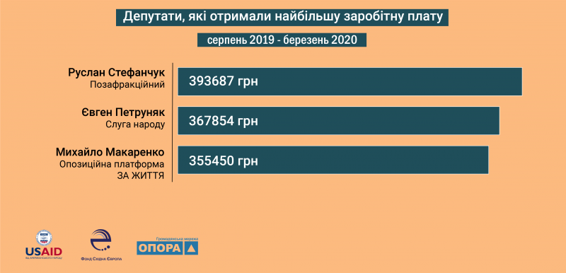 Найбільшу зарплату за період із 29 серпня 2019 року по 31 березня 2020 року отримав перший заступник голови Верховної Ради України Руслан Стефанчук (позафракційний) — 393 687,58 грн, народний депутат Євген Петруняк (фракція політичної партії «Слуга народу») — 367 854,8 грн і народний депутат Михайло Макаренко (фракція політичної партії «Опозиційна платформа – За життя») — 355 450,96 грн.