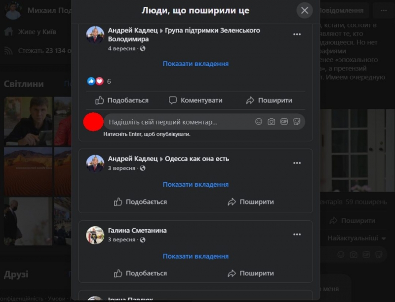 Для прикладу візьмемо допис Михайла Подоляка, датований 20 липня. У ньому радник Андрія Єрмака критикує роботу Віталія Кличка на посаді київського міського голови. Відкриваємо список реакцій: алгоритм соцмережі спершу покаже вам користувачів з-поміж ваших друзів, які відреагували на цей допис (якщо такі є), потім «друзів друзів», а потім усіх решту користувачів.