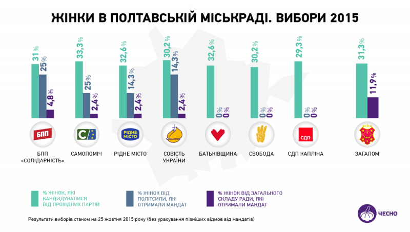 На виборах до міської ради у 2015 році гендерну повністю дотримала лише «Самопоміч». У їхньому списку кандидатів була рівно третина жінок — 7 із 21. З чотирьох кандидатів, які отримали мандати, була 1 жінка — Світлана Бондарєва. Однак у 2019 році її виключили з фракції та відкликали. Замість неї до ради зайшов наступний у рейтингу Дмитро Лаптєв.