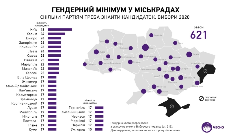 Законодавство підготувало для партій ще один виклик. Як роз’яснили Руху ЧЕСНО в ЦВК, згідно з новими правилами Виборчого кодексу, один кандидат/ка може балотуватися лише в одному окрузі — тобто в одну раду. Якщо в 2015 році одні й ті самі кандидатки від партії могли йти в облраду, міськраду, балотуватися на мера, то тепер один кандидат — одне балотування. А це означає, що одні й ті самі представниці партії не можуть закрити гендерну квоту партії в радах різних рівнів.