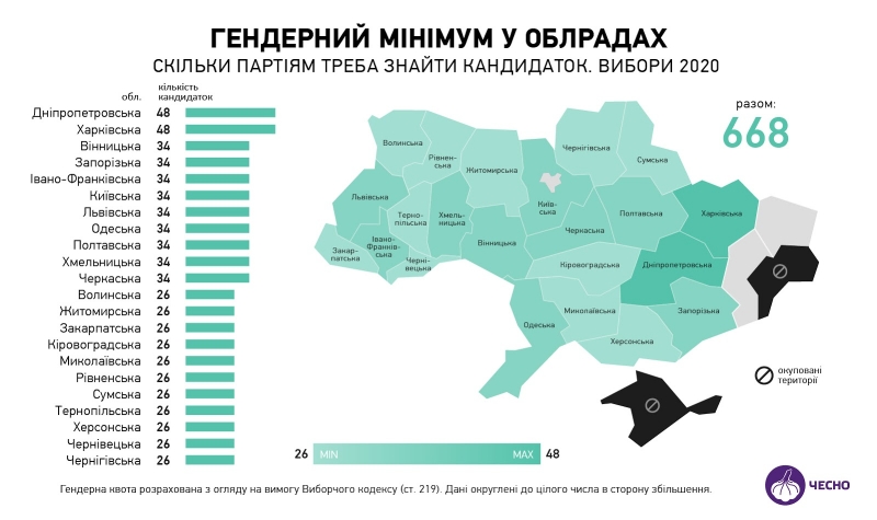 «У разі недотримання організацією політичної партії під час висування кандидатів у депутати до відповідних рад вимог Виборчого кодексу України щодо забезпечення визначеного рівня присутності у виборчих списках та переліках кандидатів — жінок та чоловіків територіальною виборчою комісією буде прийматися рішення про відмову в реєстрації всіх кандидатів», — коментує Руху ЧЕСНО членкиня ЦВК Вікторія Глущенко.